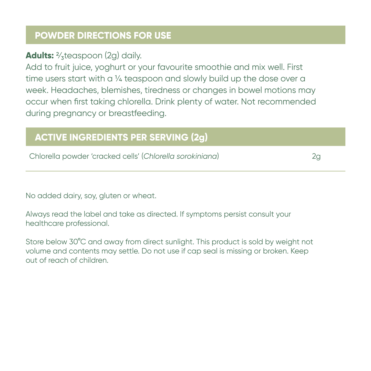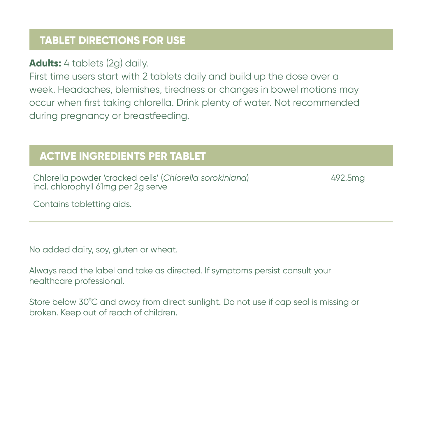 Lifestream Chlorella provides your body with high levels of chlorophyll + other plant sourced nutrients including vitamins, minerals and antioxidants. Its unique ‘cracked cell’ walls aids increased absorption + bioavailability. Chlorella supports your body with healthy cleansing + detoxification of chemicals, pollutants, toxins + some heavy metals. Packed in 100% Sugarcane Plastic packaging - kerbside recyclable.
