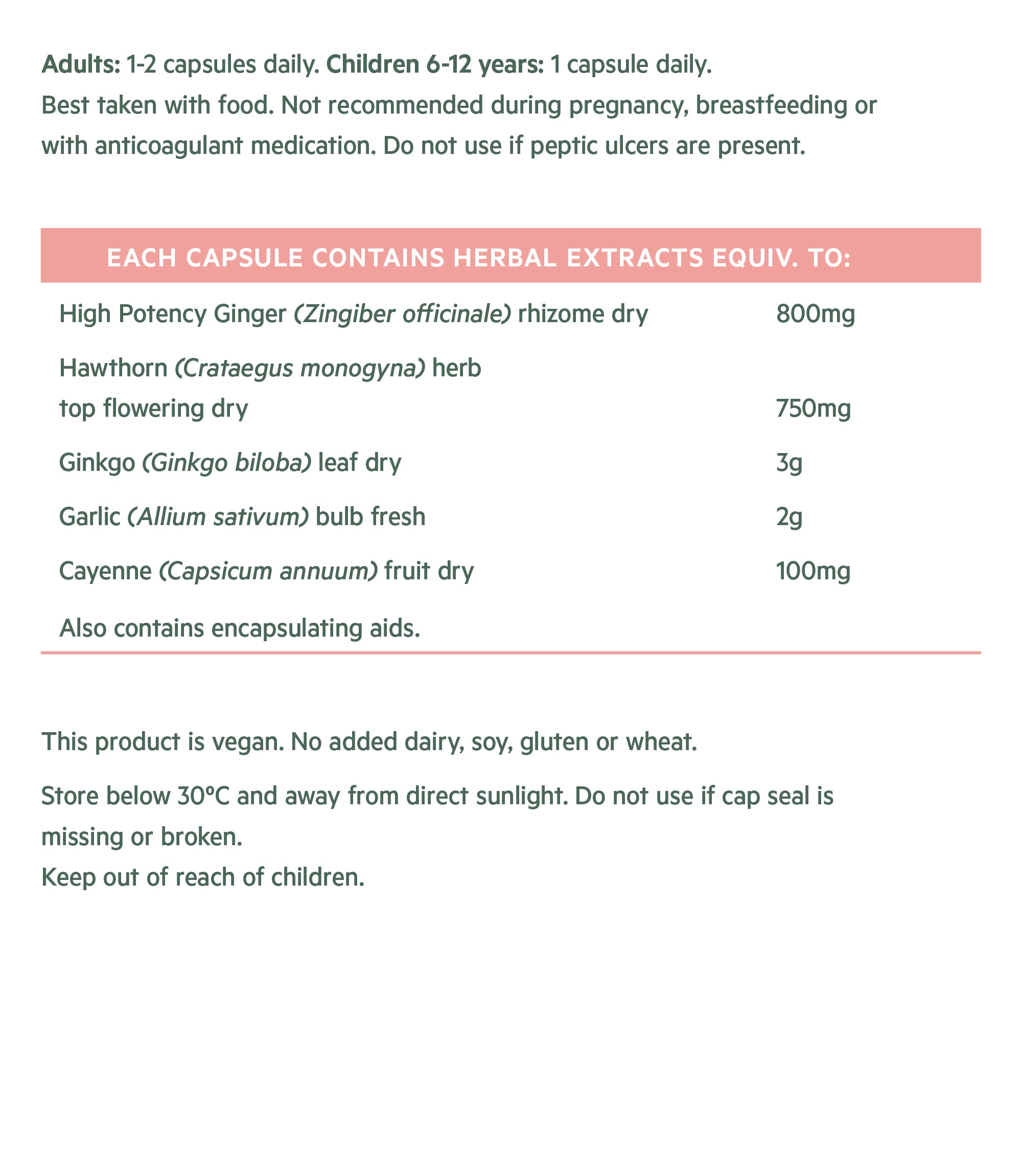 Our Circulate 5 Herbs is a unique and synergistic combination of the warming herbs Ginger and Cayenne, with Hawthorn, Garlic and Ginkgo to support circulation and heart health.
