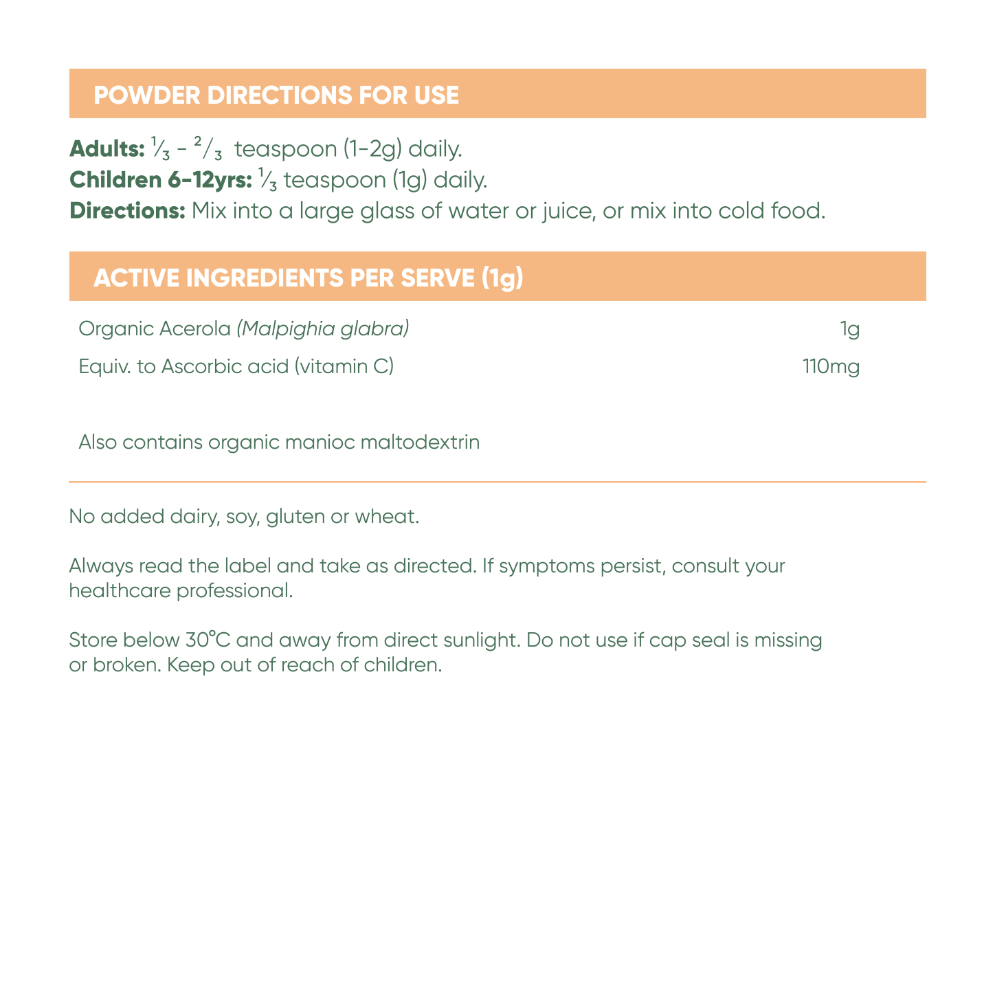 Lifestream Vitamin C Acerola is sourced from organic Acerola berries, a natural wholefood source of vitamin C, which is an essential nutrient your body can’t produce. Acerola berries also contain natural antioxidants, nutrients, anthocyanins, bioflavonoids + other co-factors for optimum absorption + well being. Packed in 100% Sugarcane Plastic packaging - kerbside recyclable.